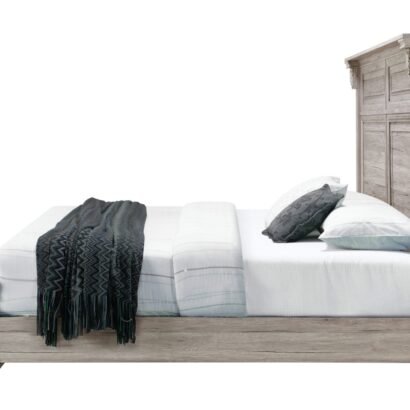 The Tatum Bedroom Collection is crafted with a rustic wood finish available in natural or grey, this classic collection boasts intricate trim, rustic drawer hardware, and elegant scroll work on every piece. The large panel headboard on the bed adds a grand touch to your bedroom.