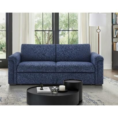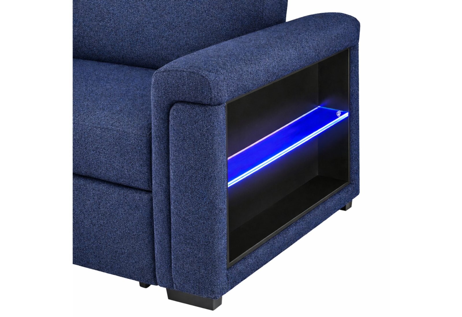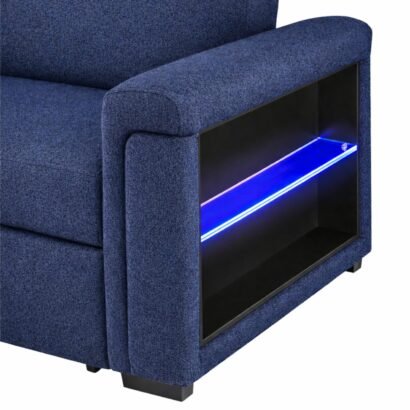 Pull-out sofa bed with LED acrylic shelves and integrated speakers, upholstered in navy fabric.