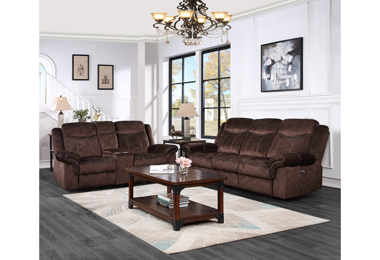 The transitional style of this beautiful motion group offers contrast baseball stitching and leather like welts along the arm and seat. The saddle bag arm adds comfort and style. The console loveseat offers a lift up storage table and two metal cup holders. Along with style and comfort, this collection includes a power recline function.