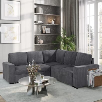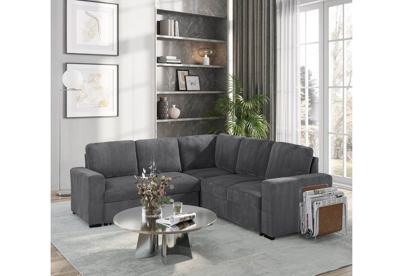 Finished in a handsome Grey corduroy fabric, this sectional exudes a contemporary charm that effortlessly complements a variety of interior styles. The luxurious fabric adds a cozy and inviting feel to your living room, creating a warm and welcoming atmosphere for you and your guests.