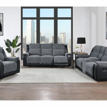 Experience ultimate comfort with the U5914 Dark Grey Reclining Collection by Global Furniture USA. This plush collection includes a reclining sofa, console reclining loveseat, and a glider recliner, all upholstered in a sophisticated two tone dark grey fabric. Each piece features generously padded cushions, supportive headrests, and easy-to-use reclining mechanisms, ensuring a relaxing seating experience. The console loveseat offers built-in cupholders and storage, while the glider recliner delivers smooth gliding motion for added relaxation. Elevate your living space with this cozy, stylish, and functional collection.