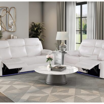 U6026 BLANCHE WHITE RECLINING SOFA, CONSOLE RECLINING LOVESEAT WITH LED AND SPEAKER