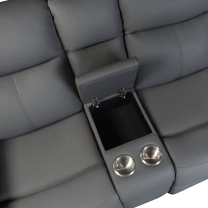 The U6026 Sectional delivers spacious comfort with a modern edge. It features a right-facing console reclining loveseat, a left-facing reclining loveseat, and a wedge for ample seating. Upholstered in sleek Grey PU, it includes manual reclining seats, LED lighting, and a convenient console with storage and cupholders—perfect for entertaining or everyday lounging.