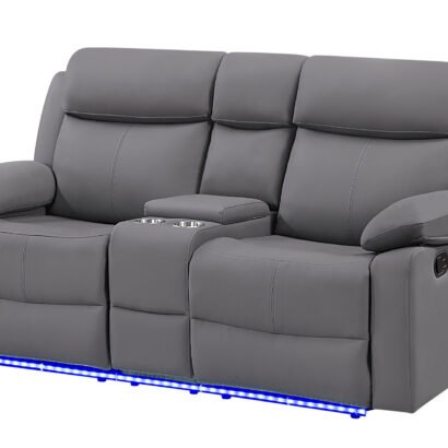 Enjoy both comfort and functionality with the U6026 Console Reclining Loveseat with LED Lighting. This loveseat, upholstered in grey PU, features generously padded cushions and a smooth reclining mechanism for ultimate relaxation. The built-in cupholders and convenient storage compartment add a practical touch, making it perfect for entertaining or cozy nights in.