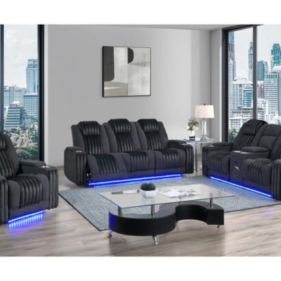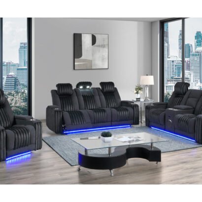 Experience next-level relaxation with the U8000 Dual Power Reclining Collection by Global Furniture USA, where innovation meets luxury. Each piece features dual power recline for personalized comfort and integrated LED lighting that enhances the room’s ambiance. Every arm includes cupholders, blending convenience with contemporary design. The power reclining sofa boasts a drop-down table with reading lights, ideal for movie nights or cozy evenings in, while the power console reclining loveseat features a storage console and built-in Bluetooth speaker, transforming your living room into a stylish entertainment hub.