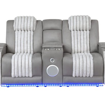 The U8000 Grey Console Reclining Loveseat pairs cutting-edge design with plush comfort. Finished in grey upholstery with soft corduroy faux fur accents, it features dual power recliners, built-in LED lighting, and convenient cupholders. The center console provides ample storage and includes a Bluetooth speaker, delivering immersive sound for your favorite music or movies. A showpiece of comfort and style.