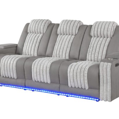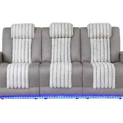 Refined and contemporary, the U8000 Grey Dual Reclining Sofa introduces soft sophistication to your space. Upholstered in elegant grey with light grey corduroy faux fur accents, this sofa offers a striking mix of tone and texture. The dual power reclining mechanism ensures personalized comfort, while the drop-down table with reading lights enhances functionality. LED lighting and built-in cupholders create a perfect fusion of comfort and modern luxury.