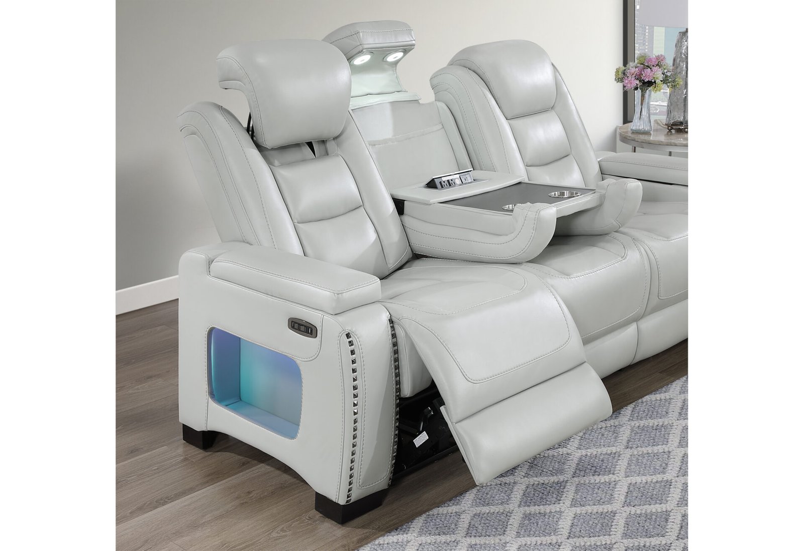 U8609 GREY POWER RECLINING SOFA/POWER CONSOLE RECLINING LOVESEAT WITH PHR, USB, LED & BOOKSHELF ARM