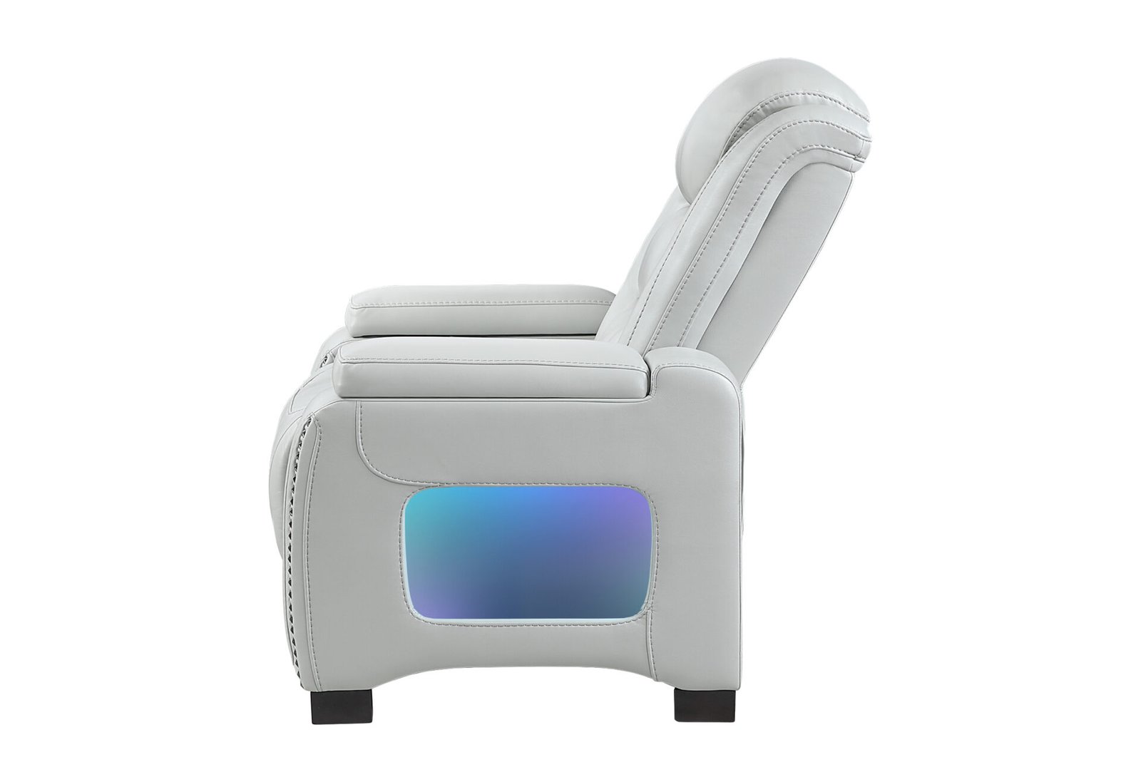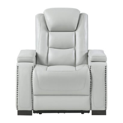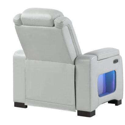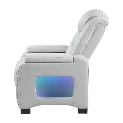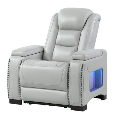 The U8609 Power Glider Recliner is a stylish, high-comfort seat designed for relaxation. Upholstered in neutral blanche silver, it features dual power reclining and power headrests, along with a USB port on the power switch for convenience. Hidden arm storage, LED-lit side pockets, and studded accents add both flair and function, making this recliner an ideal finishing piece for your living space.