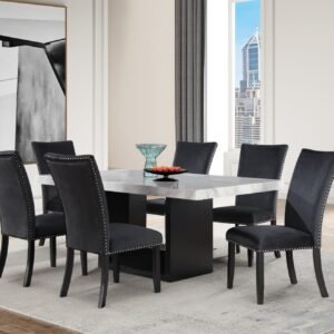 The YLime White Marble Dining Collection, a stunning addition to your dining room from Global Furniture USA. This contemporary set features a luxurious white marble tabletop, providing an elegant, durable surface for memorable meals. The sleek YLime Grey dining chairs boast a comfortable, curved design and high-quality upholstery for stylish seating. With a sturdy base and premium materials, this dining set blends sophistication and durability, creating the perfect centerpiece for entertaining and everyday use.
