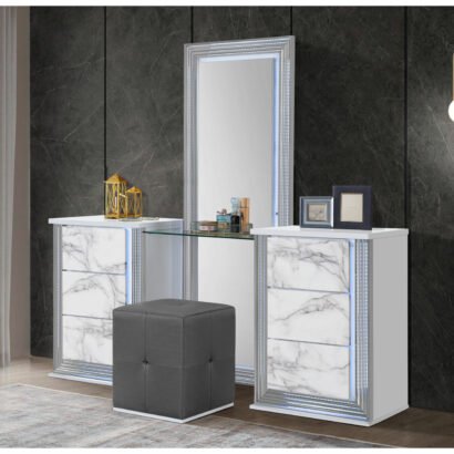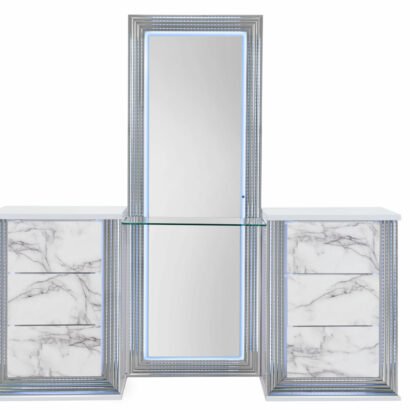 Introducing the Ylime Collection by Global Furniture USA – a stunning addition to any bedroom. Crafted with a sleek, deco modern design, this collection features rich chrome accents on all pieces and LED accent lighting. The real showstopper is the LED accents that add a touch of luxury and sophistication to the overall look. An available large matching vanity with stool makes this one of the most accommodating, complete solutions for your bedroom.
