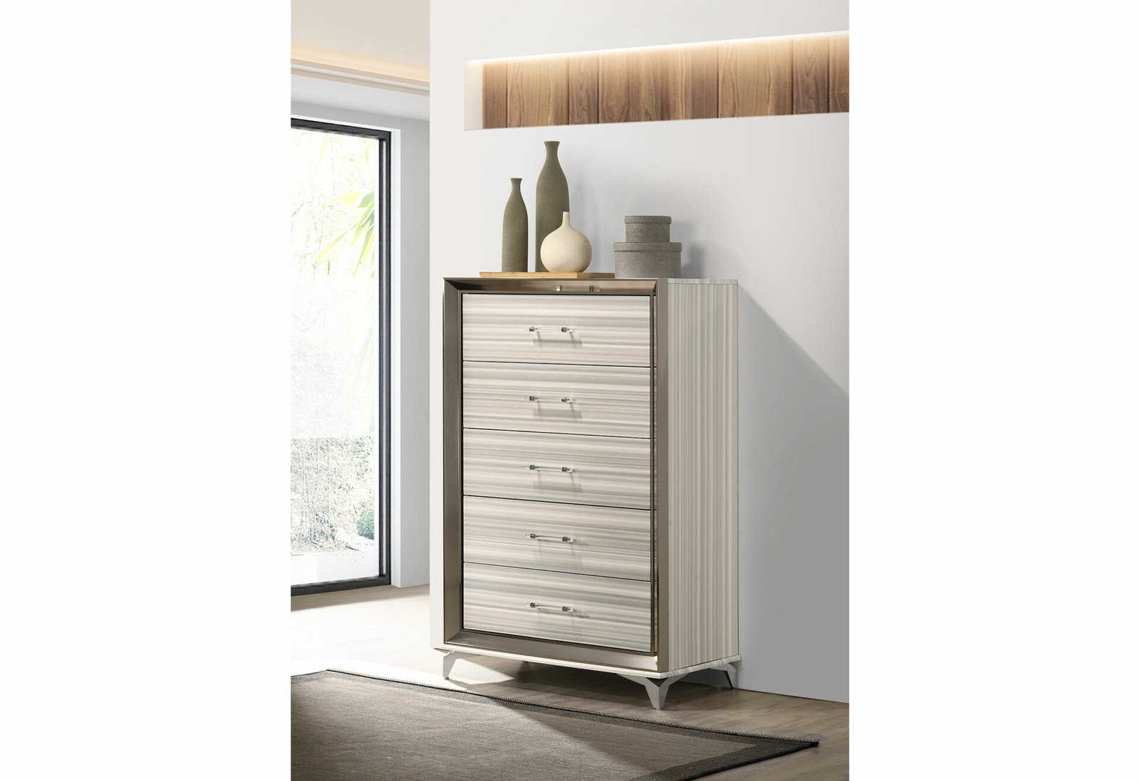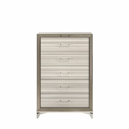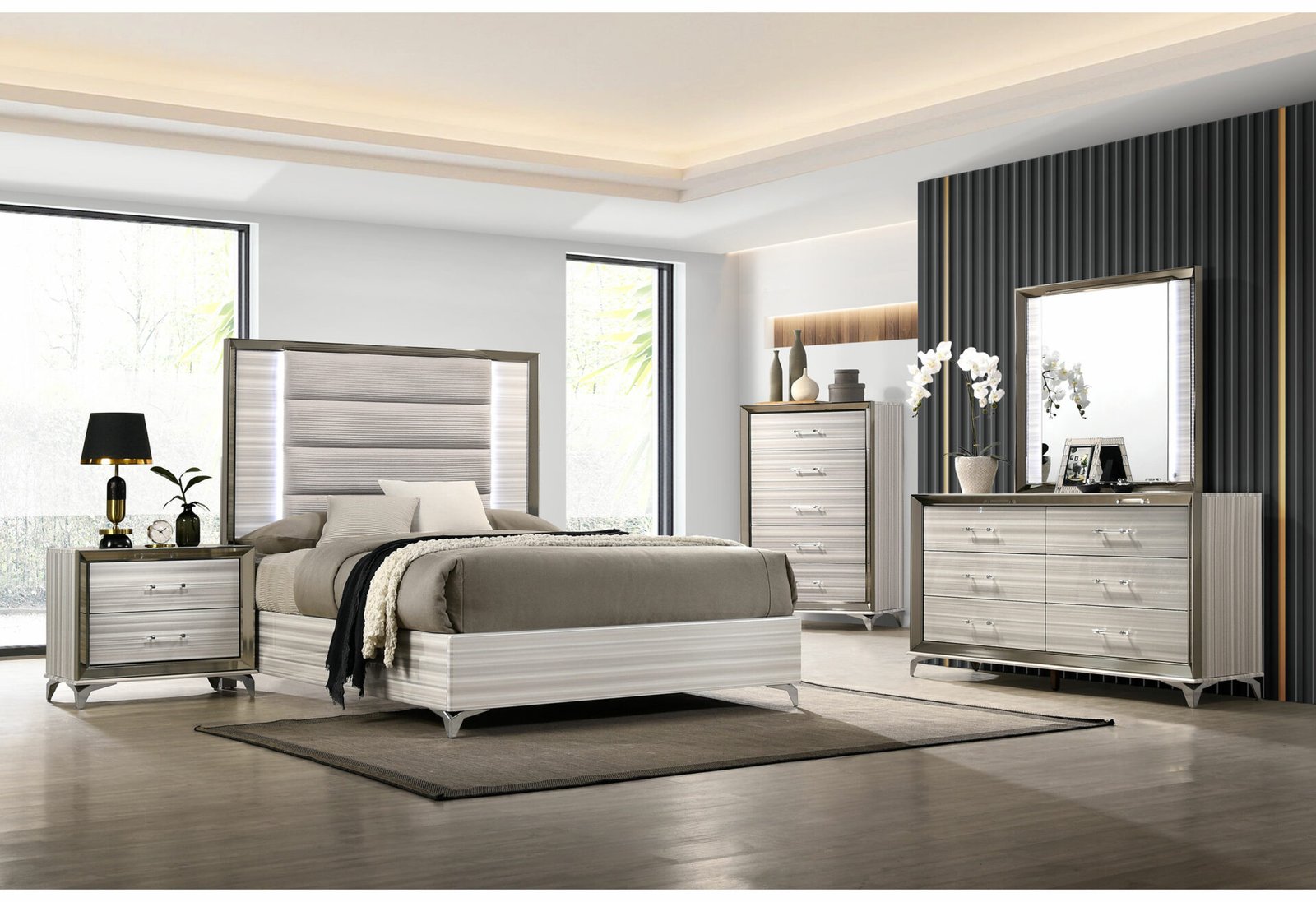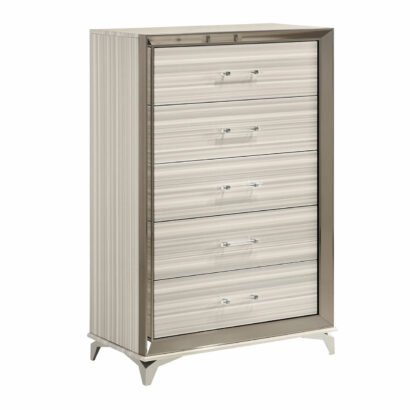The Zambrano White Collection exudes sophistication and modern charm. Its sleek design, pristine white finish, and polished chrome accents create a luxurious, inviting atmosphere. The spacious storage and built-in LED lights add functionality, making it a perfect blend of style and practicality. A stunning addition to any contemporary bedroom, the Zambrano is a must-have for those seeking both elegance and comfort.