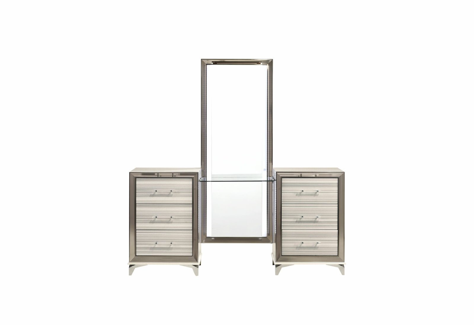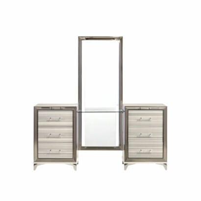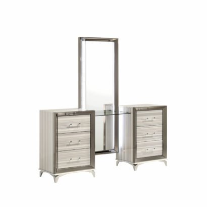 The Zambrano White Collection exudes sophistication and modern charm. Its sleek design, pristine white finish, and polished chrome accents create a luxurious, inviting atmosphere. The spacious storage and built-in LED lights add functionality, making it a perfect blend of style and practicality. A stunning addition to any contemporary bedroom, the Zambrano is a must-have for those seeking both elegance and comfort.