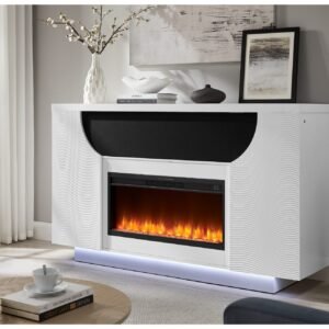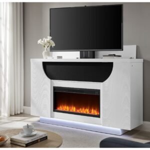 AVEENA WHITE 76″ ENTERTAINMENT UNIT WITH TV, LED, SPEAKERS, CRYSTAL INSERTS AND POP UP CENTER DOORS